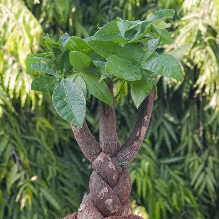 The Braided Pachira Aquatica, commonly known as the Money Tree Bonsai. It is a popular ornamental plant renowned for its unique braided trunk and lush green leaves. Native to Central and South America. This plant is often associated with good luck and prosperity. It a popular gift and home decor item.